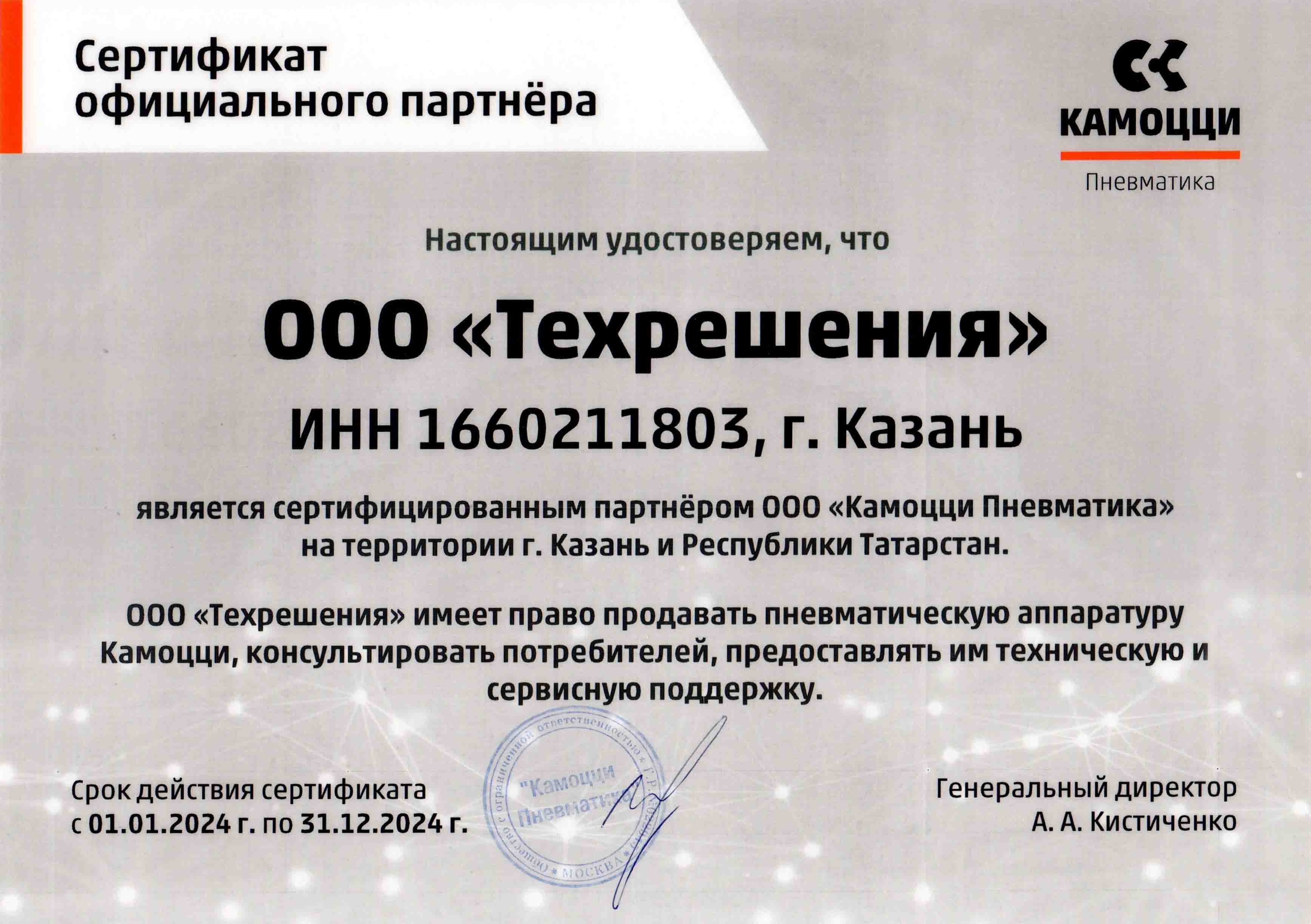 ООО «Техрешения» является сертифицированным партнером ООО «Камоцци Пневматика» на территории Казани и Республики Татарстан. Компания имеет право продавать пневматическое оборудование Camozzi, консультировать клиентов и оказывать им техническую и сервисную поддержку.
