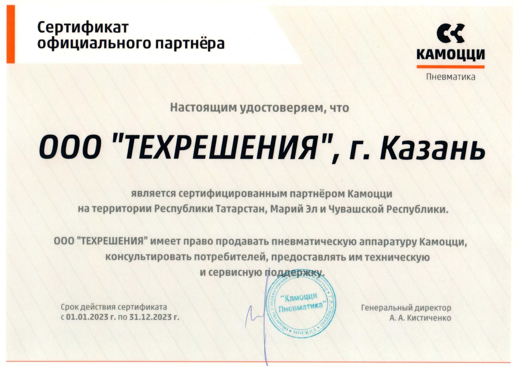 ООО "Техрешения" г. Казань является сертифицированным партнером Camozzi на территории Республики Татарстан, Марий Эл и Чувашской Республики. ООО "Техрешения" имеет право продавать пневматическую аппаратуру Камоцци, консультировать потребителей, предоставлять им техническую и сервисную поддержку.